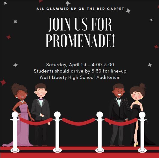 Promenade will be held on Saturday, April 1st from 4:00 - 5:00 in the High School Auditorium! Students should arrive by 3:30 for line-up.