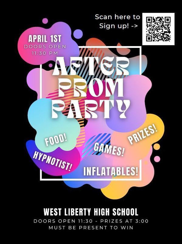 The 2023 After Prom Party will be held in the High School following Prom on April 1st. Doors open at 11:30 pm. RSVP today by scanning the QR code on the flyers or via this link: https://docs.google.com/forms/d/e/1FAIpQLScfi4_31PjYIk2k0DlP-uPnCw4QifEReAQJlrrJlnGMS7iyDw/viewform