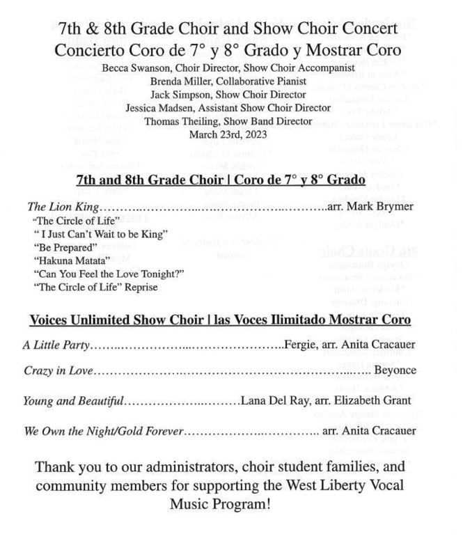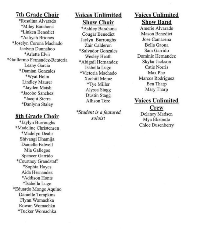 Our 7-8th Grade Choir and Voices Unlimited, our High School Show Choir took the stage in the High School Auditorium on Thursday, March 23rd! It was quite a show!
