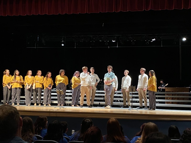 Following their performance, Voices Unlimited came to the front of the stage while senior, Tye Miller took the opportunity to thank Choir Director, Mr. Simpson, Assistant Director, Mrs. Madsen, and Show Band Director, Mr. Theiling for guiding them through their season. They then presented Mr. Simpson with a gift for his amazing leadership and for "changing all of their lives."