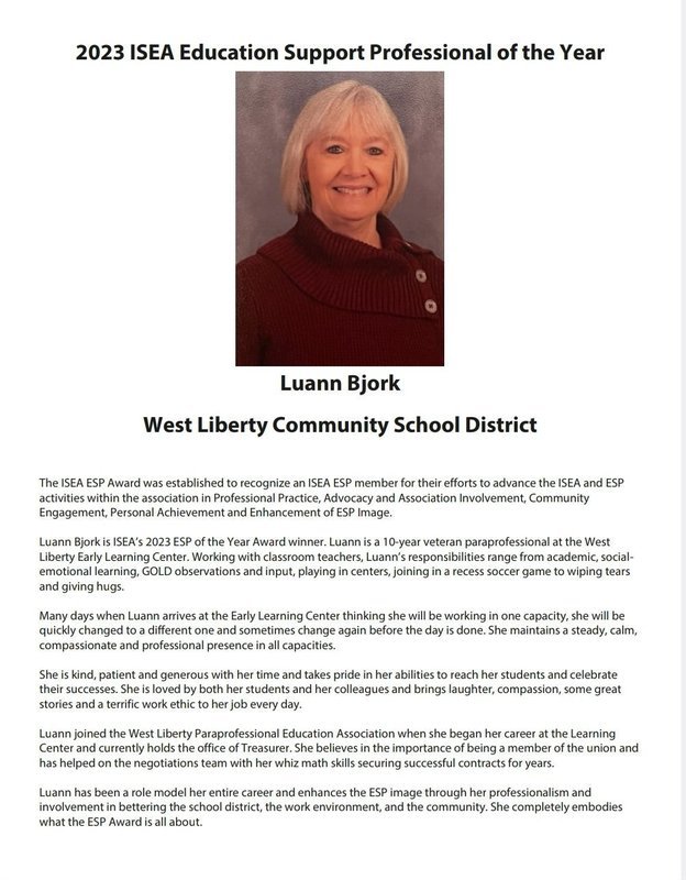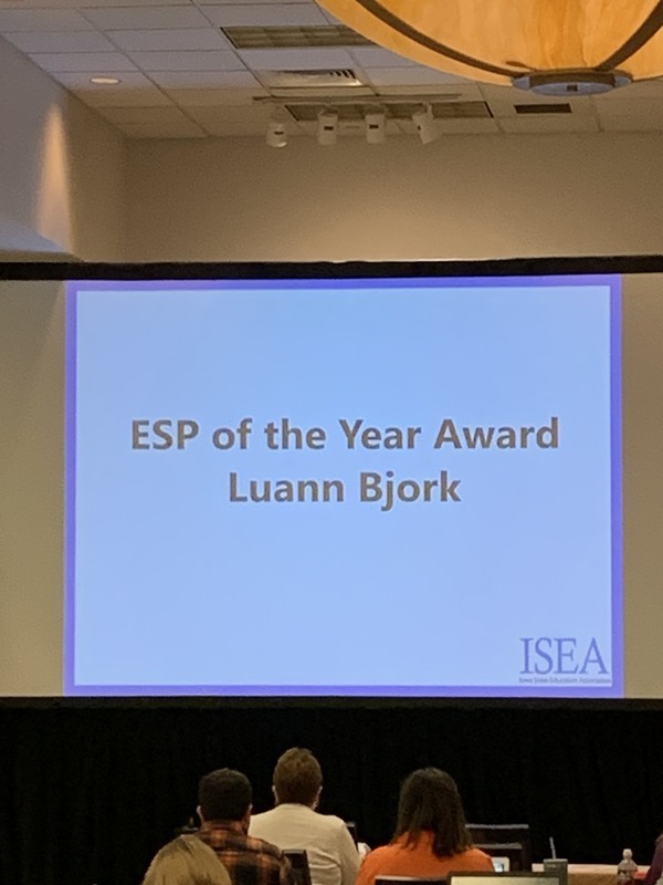 Today is Paraprofessional Appreciation Day! We are kicking it off by announcing that ELC Para, Luann Bjork, received the Iowa State Education Association (ISEA) Education Support Person the Year Award on Saturday in Des Moines! We are very proud of Luann and so grateful that she is a member of our Comet family!