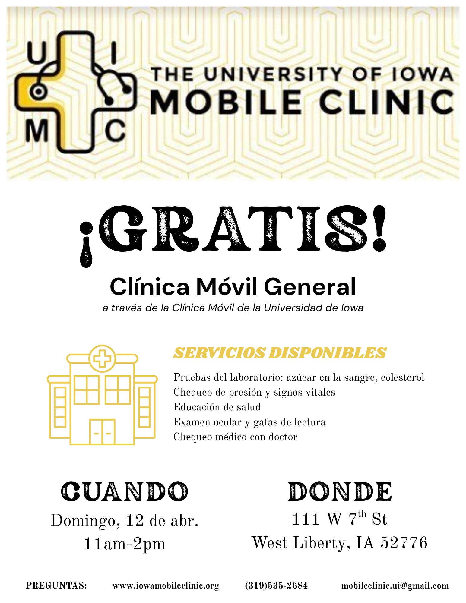 Our friends at the University of Iowa Free Mobile Clinic will be holding a clinic on Sunday, April 12th, from 11:00 am -2:00 pm at the
