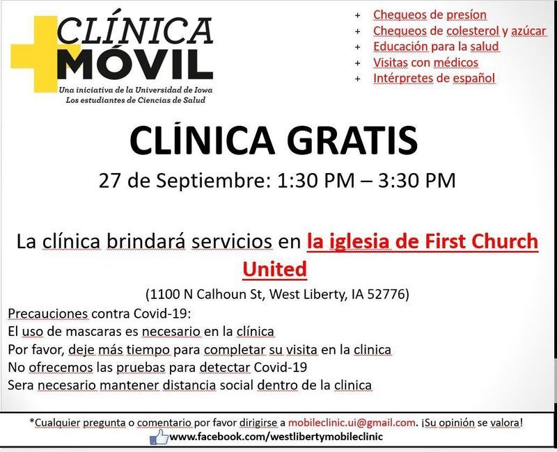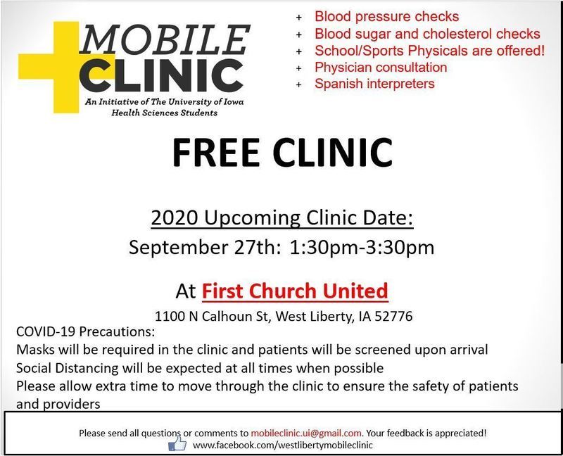 The next University of Iowa Free Mobile Clinic will be this Sunday, September 27th from 1:30 - 3:30 pm at First Church United, 1100 N Calhoun St, West Liberty.