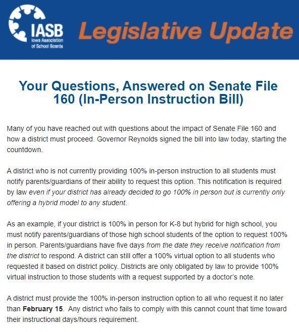 We received the guidance below from the Iowa Association of School Boards today. We will continue to share information as we receive it.