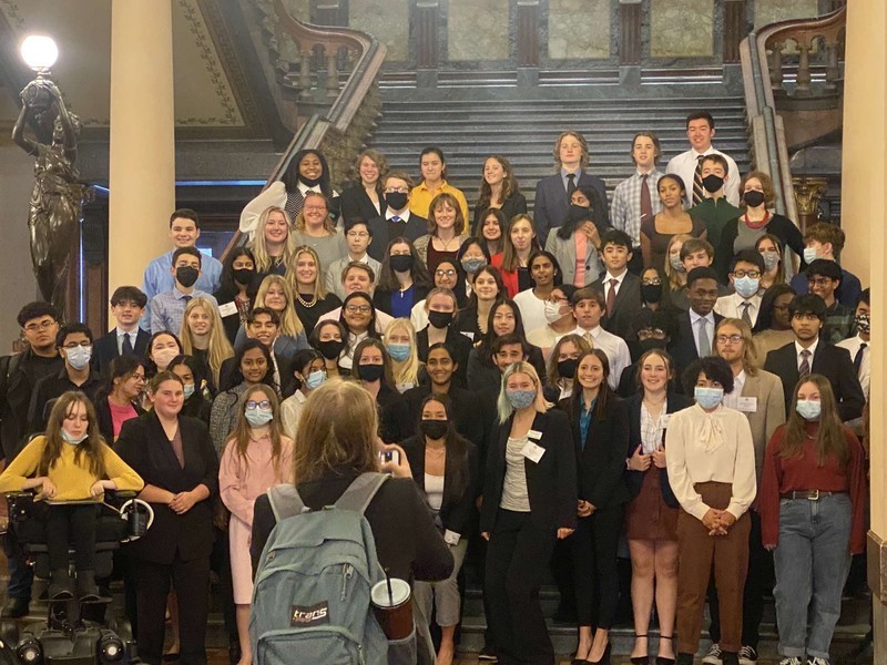 2021 Iowa Youth Congress students: John Quinones Centeno is pictured in the 4th row on the far left directly in front of the statue; Amerie Alvarado is also in the 4th row, 5th from the left.