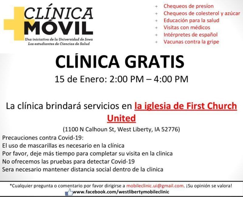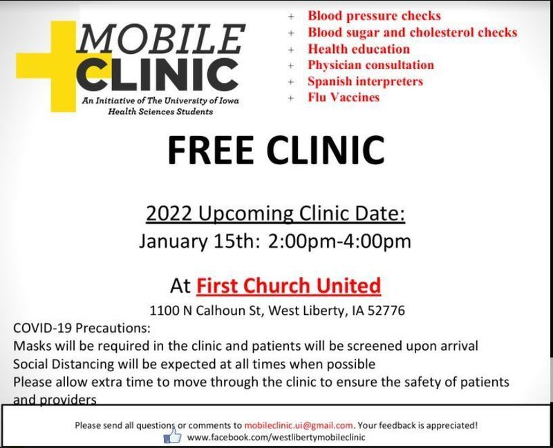 The next University of Iowa Free Mobile Clinic will be held this Saturday, January 15th, from 2:00 - 4:00 pm at First Church United, 1100 N Calhoun St, West Liberty.