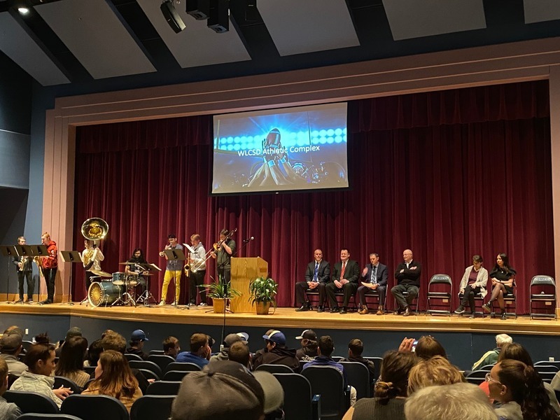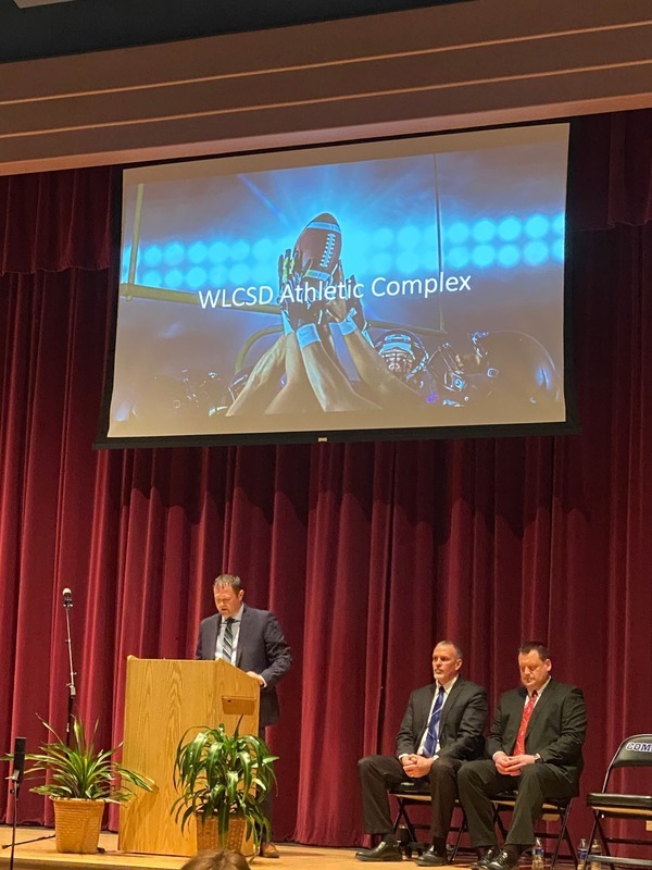 WEST LIBERTY, IA – On Tuesday, March 29th at 6:30pm the West Liberty Community School District hosted a press conference in the high school auditorium. Over 100 community members came out to hear details on school district strategy and plans for the new athletic complex. The event kicked off with music from a high school band group, and both Superintendent, Shaun Kruger, and Activities Director, Adam Loria, spoke about construction plans and funding for the project. At the end of the program, the superintendent announced a $50,000 gift from Larry and Gloria Dlouhy of Bettendorf, IA to kickstart fundraising.